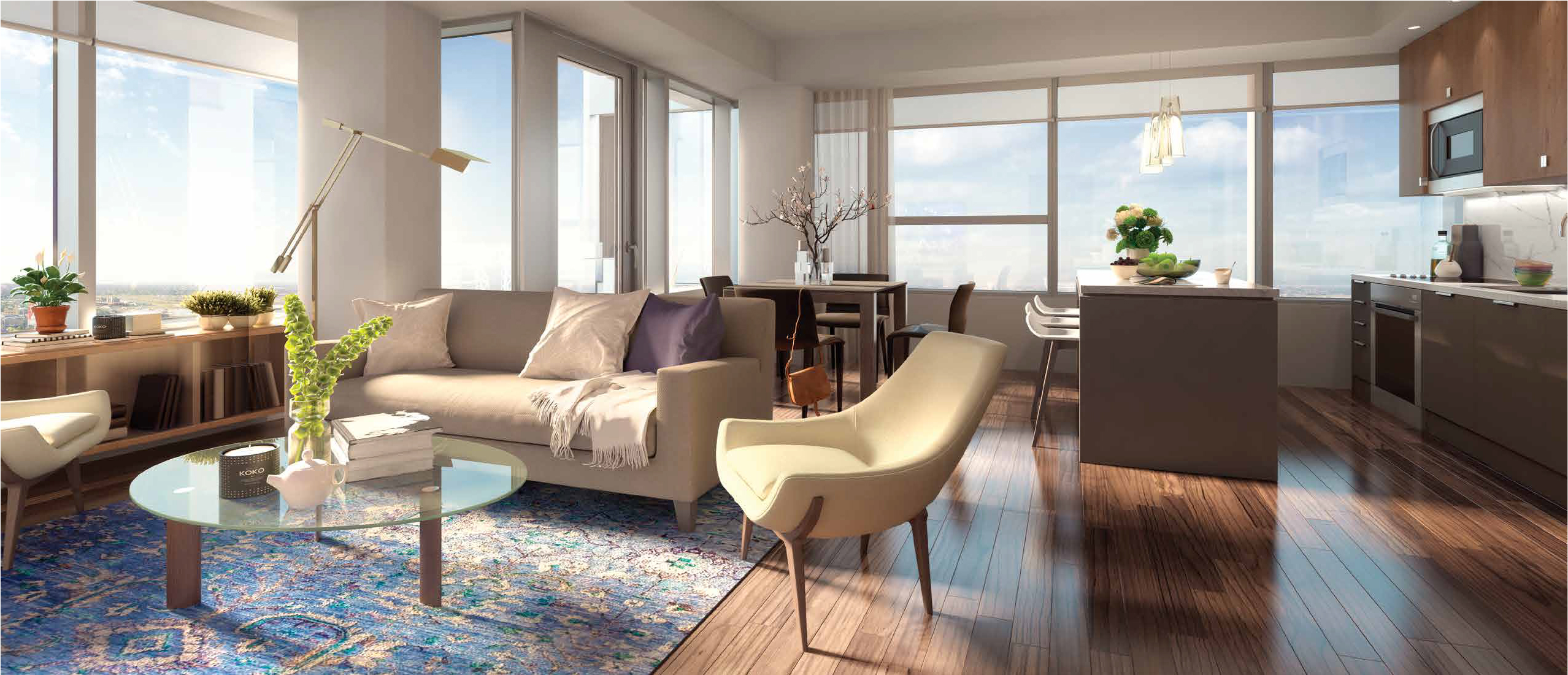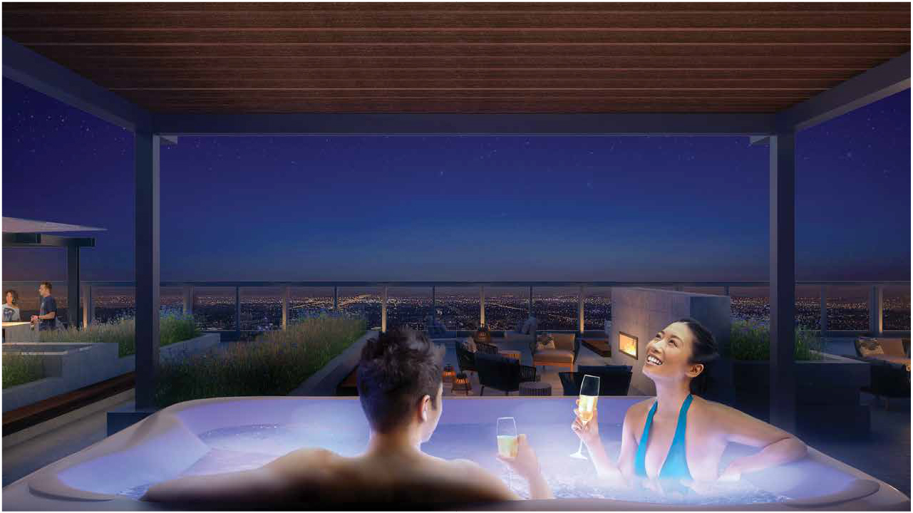 Sky Residences樓高66層,是加拿大西部地區的最高物業,住宅樓層為30樓至66樓,提供483個單位。物業共有4層零售店和通往新JW酒店的通道。另提供2萬平方呎的共享空間,商業中心、多媒體娛樂室、健身室、桑拿室、撲克酒廊、檯球俱樂部、瑜伽中心及特大的SPA熱水浴和燒烤區供住戶使用,會所設施一應俱全。
